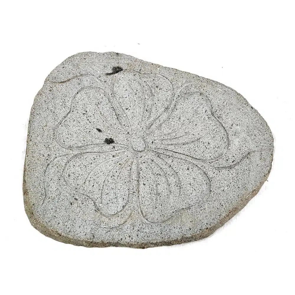 Setzen Sie mit dieser eleganten Gehwegplatte aus Stein ein Statement in Ihrem Garten! Die Platte ist 3 cm dick und beeindruckt mit einer kunstvoll eingearbeiteten großen Hibiskusblüte – ein echter Hingucker, der tropisches Flair und Exklusivität vereint.