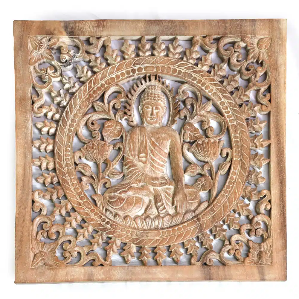 Dieser handgefertigte Wandschmuck aus Bali bringt spirituelle Ruhe und kunstvolle Eleganz in Ihr Zuhause. Auf einer Größe von 40 x 40 cm ist im Zentrum des Designs ein Buddha abgebildet, umrahmt von kunstvoll geschnitzten, feinen Ornamenten, die traditionell balinesische Muster widerspiegeln. Die White-Washed-Farbgebung verleiht dem Stück eine sanfte, antike Ästhetik, die sich perfekt in moderne wie auch traditionelle Wohnräume einfügt.