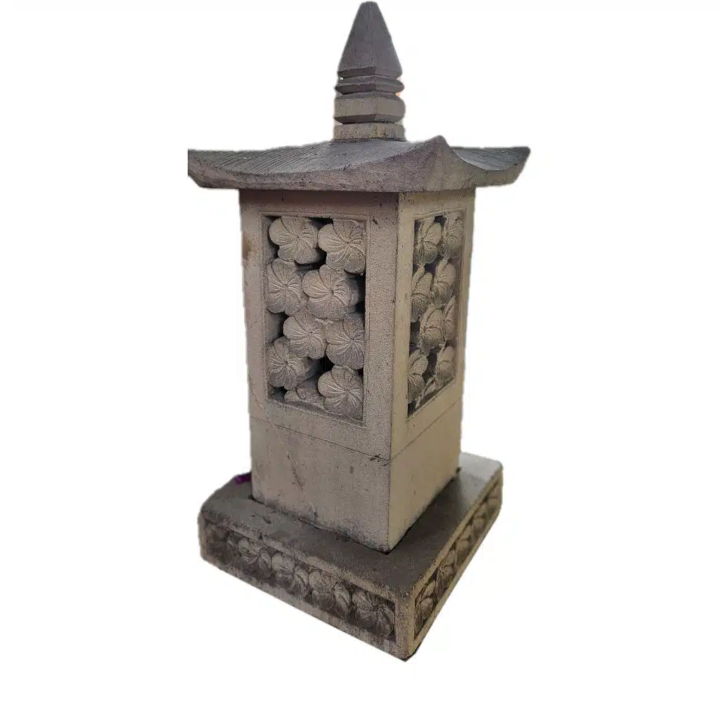 Gartenlaterne aus unbehandeltem Kalkstein mit balinesischem Dach und Plumeria-Muster
