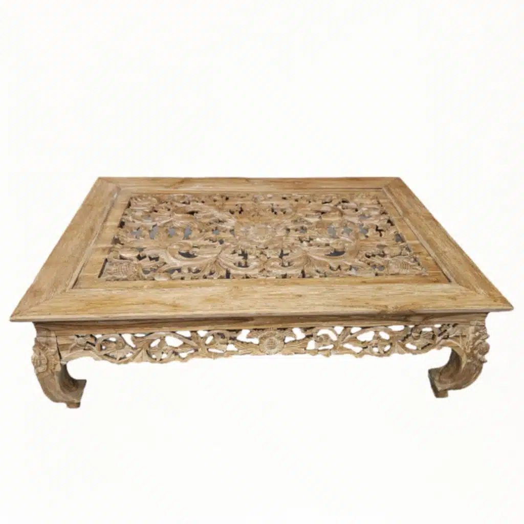 Dharana bedeutet im Sanskrit „Fokus“ oder „Versenkung“ – passend zu diesem Tisch, der mit seiner Präsenz zum Verweilen einlädt. In der balinesischen Kultur gelten geschnitzte Möbel nicht nur als Dekoration, sondern als Ausdruck spiritueller Verbindung. Die floralen Motive und geschwungenen Beine orientieren sich an traditionellen Opiumtischen aus Asien, finden hier jedoch ihre Veredelung durch meisterhafte Handarbeit und hochwertiges Teakholz.