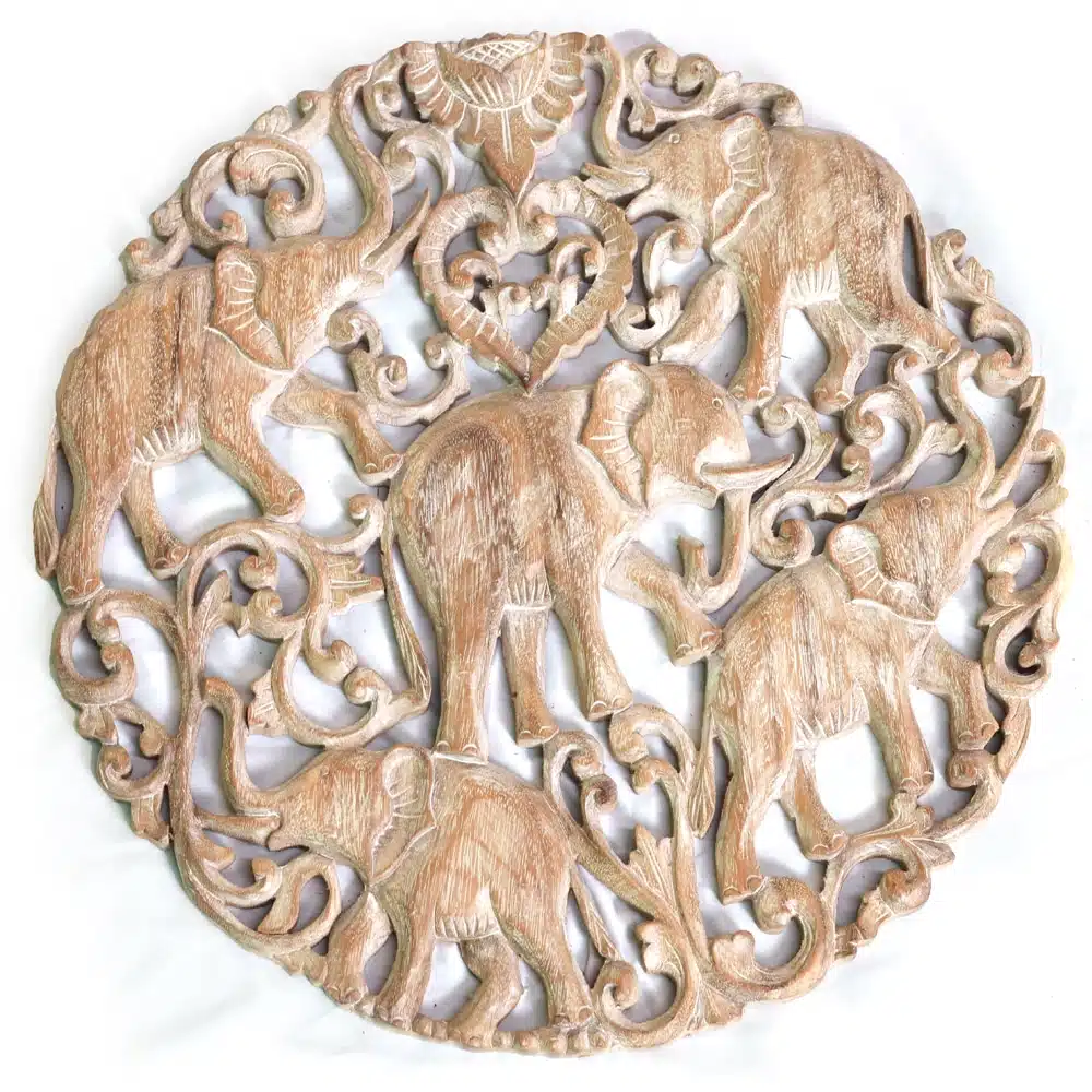 Dieses einzigartige runde Wanddekor in Whitewashed-Optik ist ein kunstvolles Stück balinesischer Handarbeit, das die Schönheit und Eleganz einer Elefantenherde einfängt. Mit einem Durchmesser von ca. 40 cm zeigt das Relief filigrane, miteinander verbundene Elefanten, die durch geschwungene Linien harmonisch miteinander vereint sind. Die Whitewashed-Farbgebung verleiht dem Dekor eine dezente, antike Ästhetik, die sich sowohl in moderne als auch traditionelle Räume einfügt.