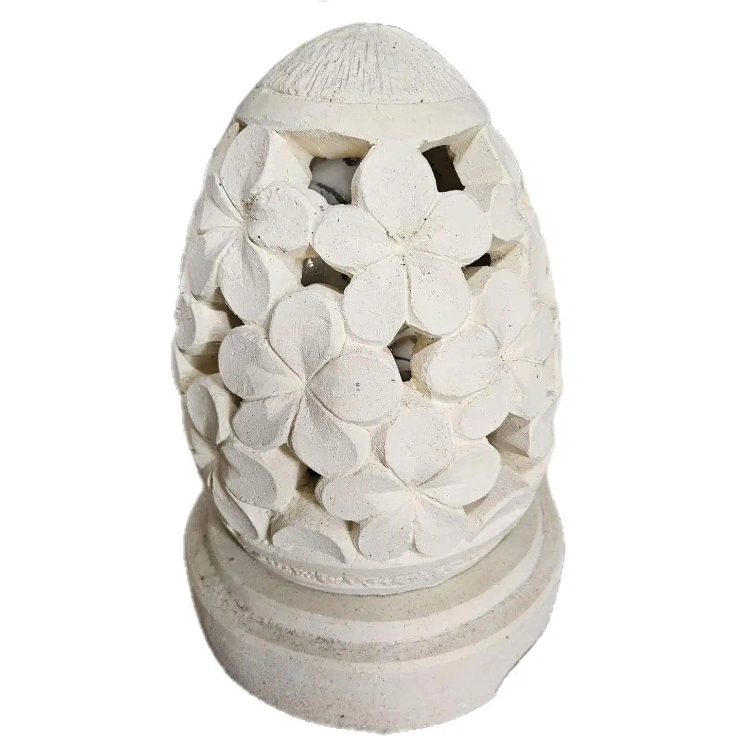In Bali steht die Frangipani Blüte für Reinheit, Liebe und spirituelle Kraft. Dieses Motiv prägt die gesamte Oberfläche des Gartenaufstellers und schenkt ihm eine besondere Ausdruckskraft. Die Ei-Form („Telur“ auf Indonesisch) unterstreicht die Symbolik des Neuanfangs und der Harmonie. Im Zusammenspiel entsteht ein Dekorationsobjekt, das im Garten, auf der Terrasse oder am Eingangsbereich eine friedvolle Atmosphäre schafft.