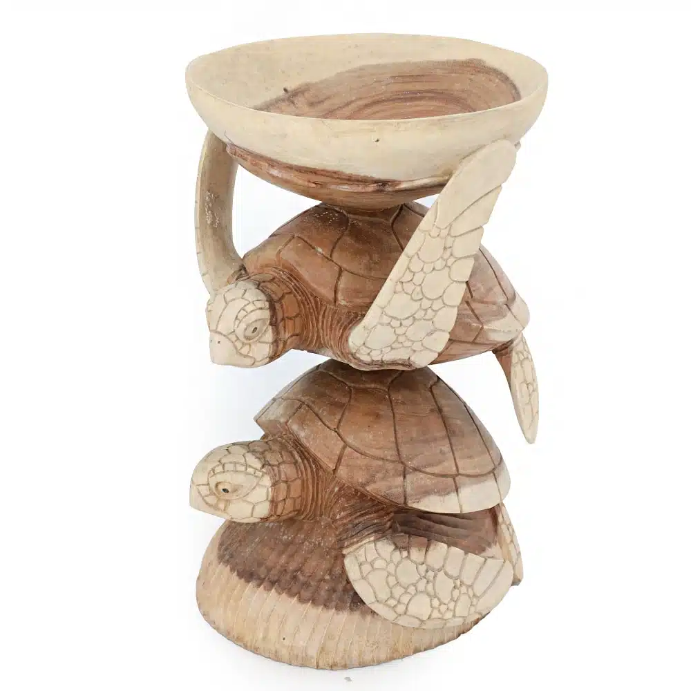 Dieser eindrucksvolle Aufsteller aus Suar-Holz vereint künstlerische Handwerkskunst und vielseitige Funktionalität. Mit einer Höhe von einem Meter tragen zwei kunstvoll geschnitzte Schildkröten auf ihren Rücken eine großzügige Obstschale, die durch ihre Detailtreue und das warme, lackierte Holz zum Blickfang in jedem Raum wird. Sorgfältig von Hand auf Bali gefertigt, begeistert dieses Stück mit den feinen, liebevoll geschnitzten Details und der natürlichen Schönheit des Holzes.