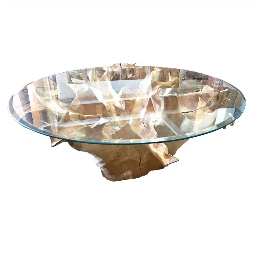 Jimbaran Glastisch: Runde Teakwurzel mit Glasplatte, Ø 100 cm