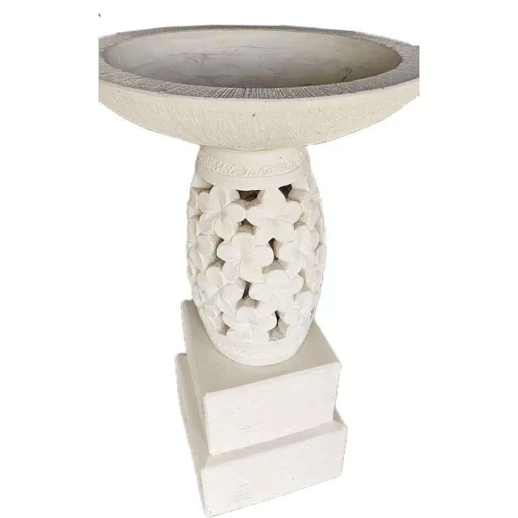Die große, runde Steinschale ruht auf einem kunstvoll verzierten bauchigen Frangipani-Sockel, der durch seine offenen Blütenreliefs eine luftige Leichtigkeit ausstrahlt. Die handgeschnitzten Frangipani-Blüten (auf Balinesisch „Jepun“) symbolisieren Reinheit und Leben und machen diese Vogeltränke zu einem stilvollen Highlight. Alternativ setzt sie als Blumenkübel tropische Akzente in Gärten, auf Terrassen oder Innenhöfen. Ihre elegante Form macht sie zudem zu einem dekorativen Blickfang, der jedes Ambiente bereichert.