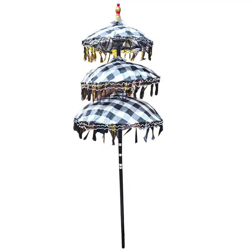 Jeder Schirm besitzt genau gleich viele weiße und schwarze Karos, um diese Balance zu wahren. Die drei übereinanderliegenden Schirme repräsentieren die höchsten Gottheiten des balinesischen Hinduismus: