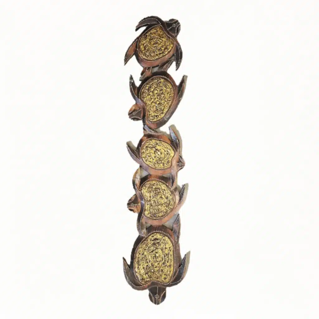 „Kura“ bedeutet Schildkröte in der indonesischen Sprache – und steht in vielen Kulturen für Langlebigkeit, Geduld und innere Stärke. Diese handgefertigte Wanddekoration erzählt in fünf sanft geschwungenen Figuren von der Reise durchs Leben. Die goldfarbenen Akzente verleihen den Tieren eine edle Ausstrahlung und lassen die Oberfläche lebendig wirken – wie Sonnenlicht auf Wasser.