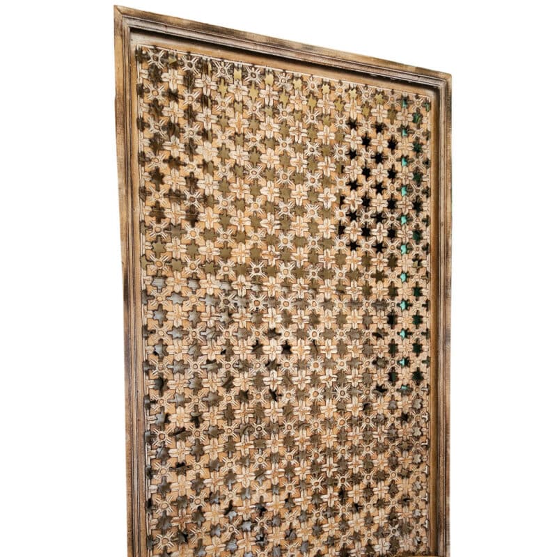 Das Puspa Wandpaneel bringt die kunstvolle Ästhetik Balis in Ihr Zuhause. Der Name Puspa, das indonesisch/sanskritische Wort für Blüte oder Blume, spiegelt das filigrane, sich wiederholende florale Muster wider, das diesem Objekt seinen einzigartigen Charme verleiht. Gefertigt aus robuster MDF (mitteldichter Holzfaserplatte), präsentiert sich das Paneel als großflächiges, durchbrochenes Kunstwerk. Die Oberfläche ist mit einem warmen, dunkelbraunen Finish veredelt, das den traditionellen Batik-Stil imitiert. Dieses Wandpaneel ist ein beruhigender und eleganter Blickfang, der durch seine filigrane Ausarbeitung besonders beeindruckt.