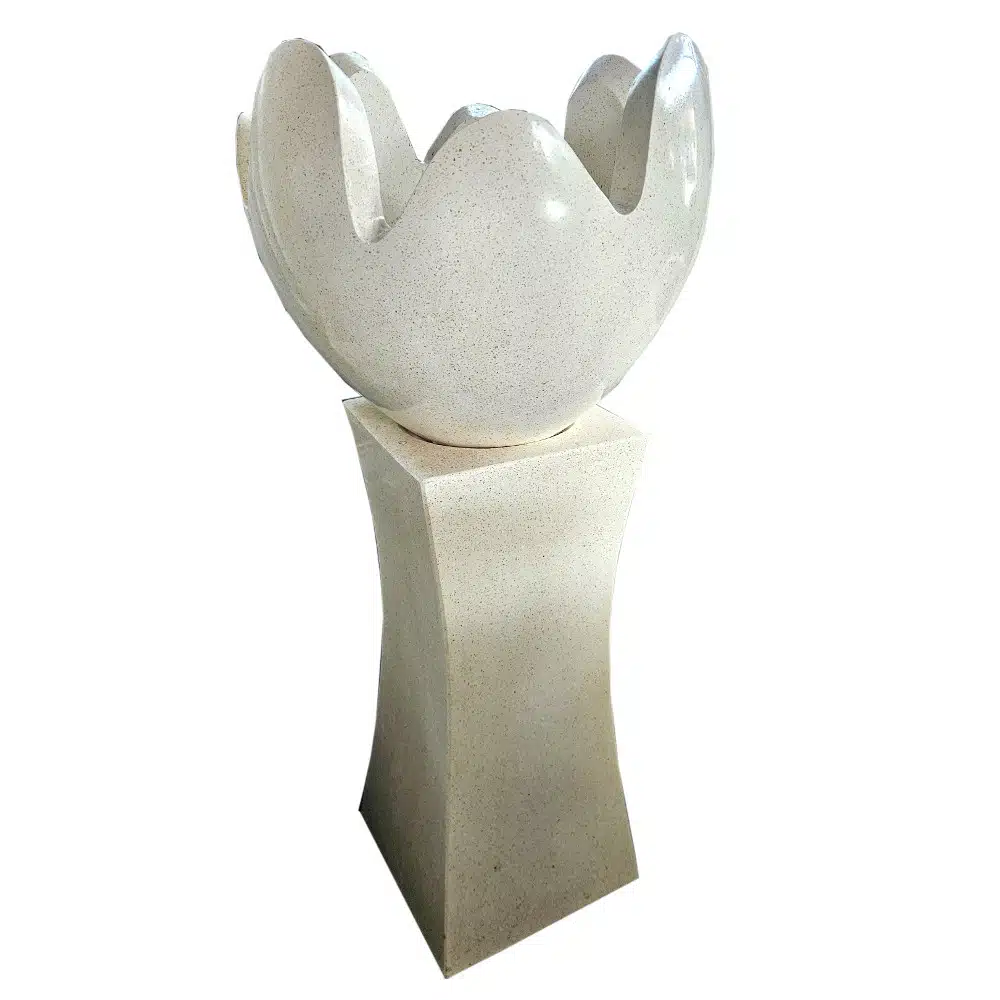 Wie eine geöffnete Blüte. Oder ein Ei, das in Bewegung gerät. Rahsa ist mehr als ein Blumenständer – es ist eine Skulptur, die etwas sichtbar macht, das sich sonst nur erahnen lässt: Wandel, Offenheit, Aufbruch. Die gebrochene Eiform auf dem schlichten Sockel wirkt ruhig und monumental zugleich – ein Statement für Innenräume, Wintergärten oder besondere Orte im Garten.