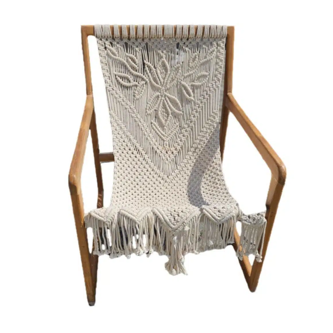 Das Gestell besteht aus massivem, naturbelassenem Teakholz – bekannt für seine Langlebigkeit und ausdrucksstarke Maserung. Sitzfläche und Lehne sind aus robustem Baumwollgarn per Hand im traditionellen Macramé-Stil geknüpft. Die leicht nach hinten geneigte Rückenlehne und die flexible Bespannung sorgen für eine besonders bequeme Sitzhaltung – ideal zum Lesen, Träumen oder einfach für eine kleine Pause vom Alltag.