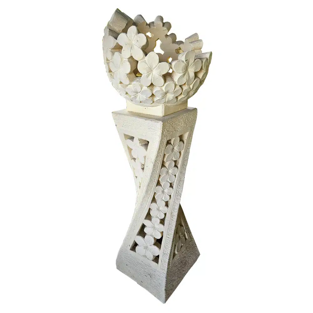 „Sari“ steht im Balinesischen für „Essenz“ oder auch „Blume“ – beides trifft auf dieses Objekt zu. Die plastisch herausgearbeiteten Blütenmotive auf Sockel und Kugel wirken wie erstarrte Leichtigkeit, eingefangen im Stein. Die dreivierteloffene Kugelform eröffnet viele Möglichkeiten: Sie kann ein sanftes Licht halten, eine Pflanze rahmen oder einfach für sich wirken.