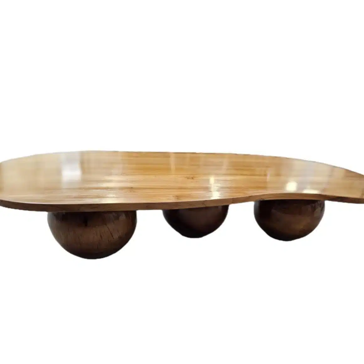 Material: Massive Teakholzkugeln, Tischplatte aus geschwungenem Bambusfurnier