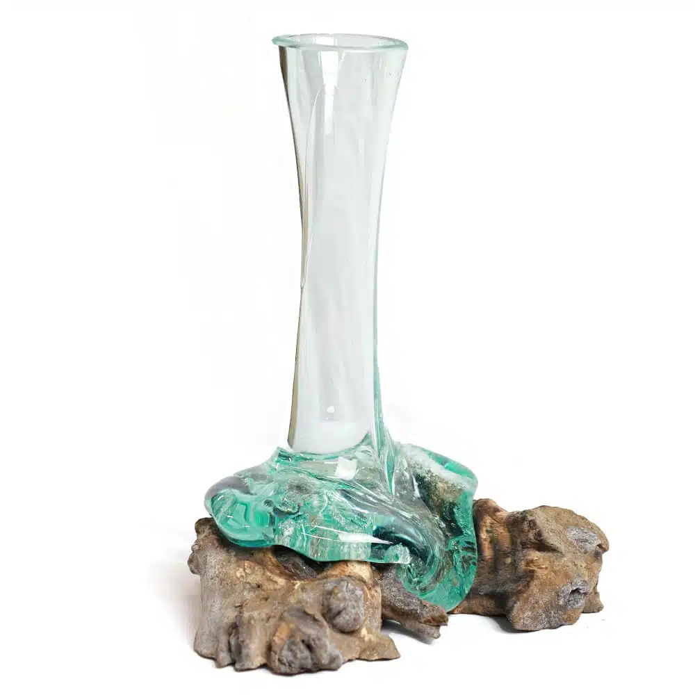 Diese einzigartige Glasvase wird auf einer natürlichen Baumwurzel präsentiert, die in kunstvoller balinesischer Handarbeit bearbeitet wurde. Mit einer Höhe von knapp 20 cm ist die Vase ein dekorativer Blickfang, der die Schönheit der Natur mit zeitloser Eleganz vereint. Die Vase lässt sich problemlos entfernen und kann auch separat genutzt werden, während die Baumwurzel selbst als stabile und natürliche Basis dient.