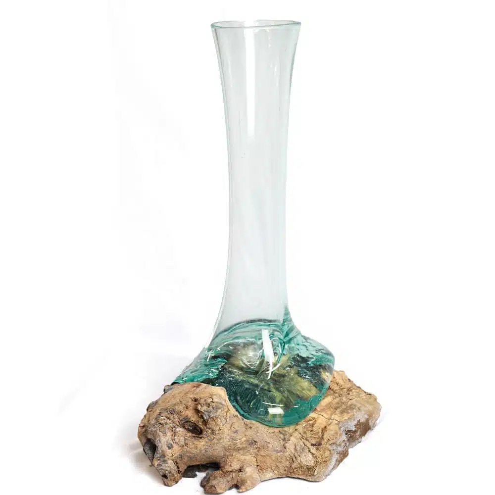 Das Glas wurde direkt auf die Baumwurzel geschmolzen, wodurch die markanten und organischen Formen des Holzes in das Design integriert sind. Dank des individuellen Wuchses jeder Baumwurzel ist jede Vase ein unverwechselbares Unikat, das durch seine charakteristische Struktur und einzigartige Oberfläche besticht.