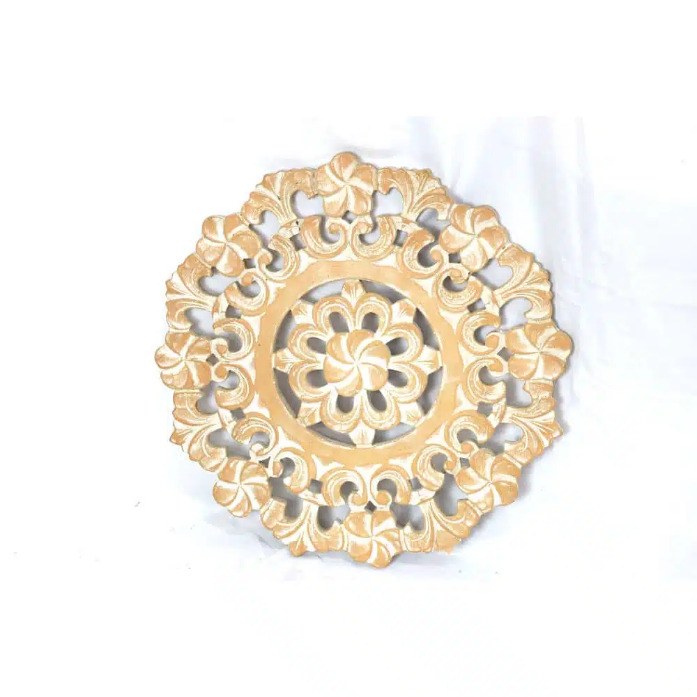 Dieser beeindruckende Wanddekor mit einem Durchmesser von ca. 50 cm bringt die exotische Schönheit der Plumeria-Blüte in Ihr Zuhause. Im Zentrum erstrahlt eine kunstvoll gestaltete Plumeria-Blüte, umgeben von weiteren, dezent verteilten Blüten, die dem Dekor eine harmonische und stilvolle Anmutung verleihen. Die Oberfläche ist in einem eleganten Whitewashed-Finish gehalten, das die filigrane Handarbeit betont und zugleich eine moderne, dezente Note einbringt. Hergestellt in traditioneller balinesischer Handarbeit, ist jedes Stück ein Unikat und verkörpert die hohe Kunstfertigkeit der Insel. Perfekt als Highlight für Wohn- oder Schlafzimmer, bringt dieser Wanddekor einen Hauch tropischer Eleganz in jeden Raum.