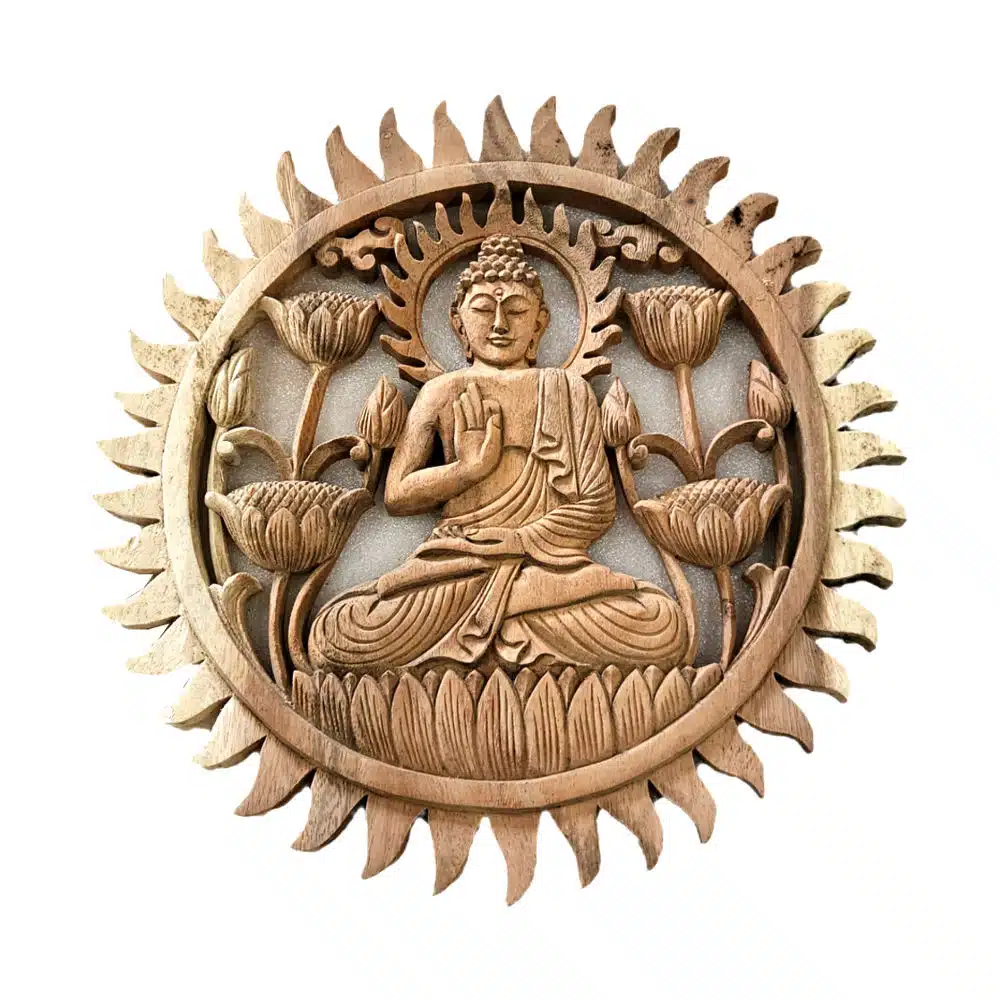 Dieses Wanddekor verbindet die spirituelle Kraft des Buddha mit der Lebendigkeit der Sonne – eine perfekte Kombination aus Kunst, Natur und Bedeutung.