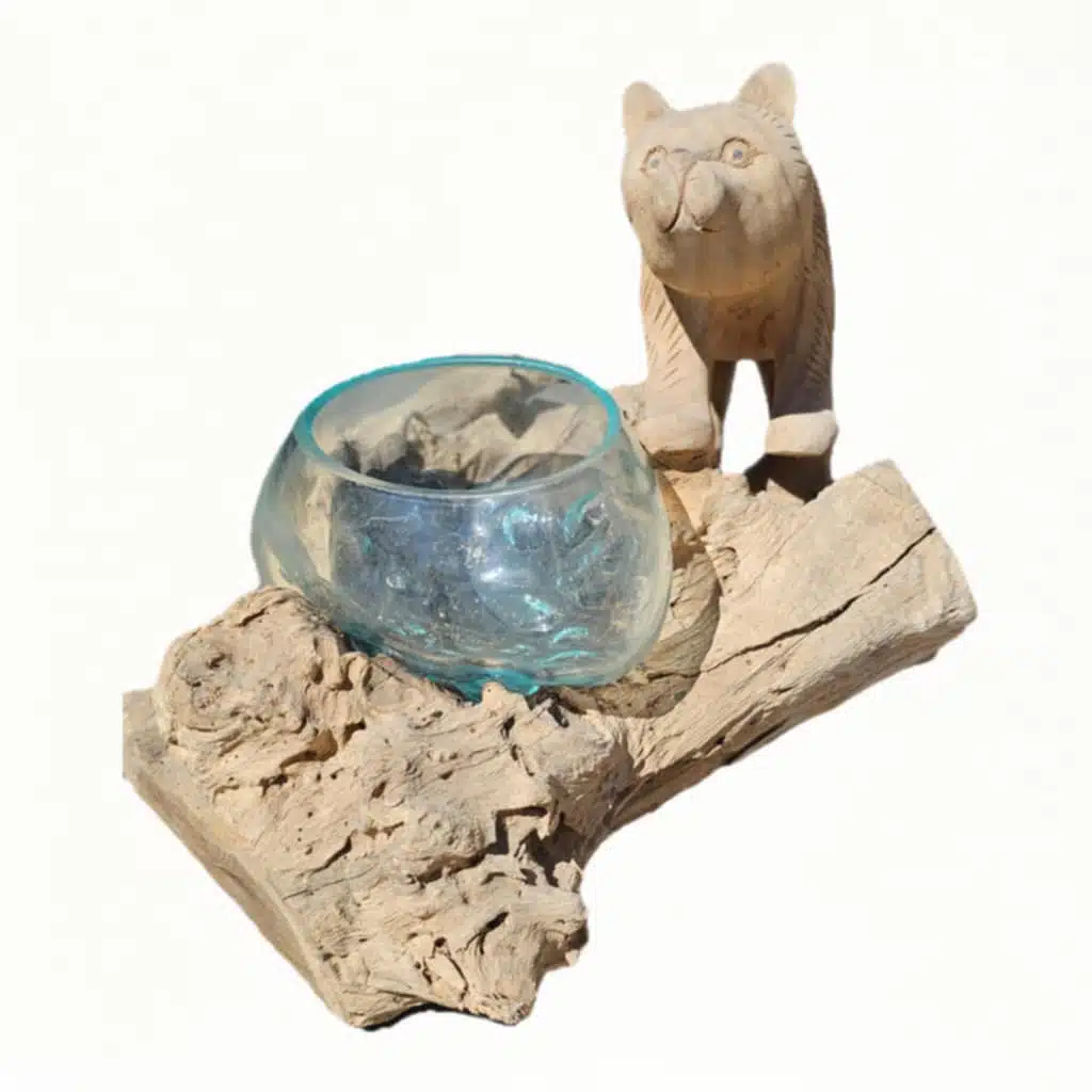 Obwohl Bären nicht auf Bali heimisch sind, steht die geschnitzte Figur symbolisch für die Verbindung zwischen Tierwelt und Mensch. Sie erinnert an einen friedlichen Waldbewohner, der achtsam über das natürliche Gleichgewicht wacht. Die fließend eingebettete Glasschale wurde in geschmolzenem Zustand direkt auf das Wurzelholz angepasst – so entsteht eine organische Einheit aus Form, Material und Bedeutung.